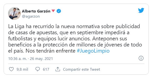 1 junio, 2021Javier Tebas, presidente de La Liga, ha recurrido la normativa sobre publicidad en casas de apuestas, que entra en vigor a partir de septiembre. Alberto Garzón avisa a Tebas «nos tendrán enfrente».
