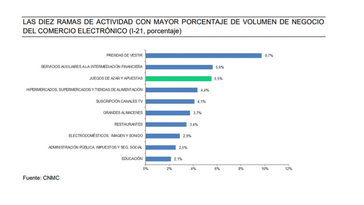 Los sectores de actividad con mayores ingresos han sido las prendas de vestir, con el 9,7% de la facturación total; los servicios auxiliares a la intermediación financiera, con el 5,6% y, en tercer lugar, los juegos de azar con el 5,5%.