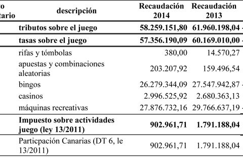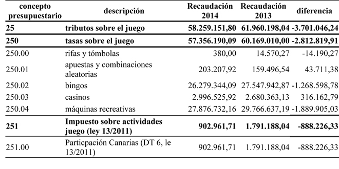 Comparando los años 2014 y 2013. Las tasas sobre el juego también descendieron 2,8 millones.